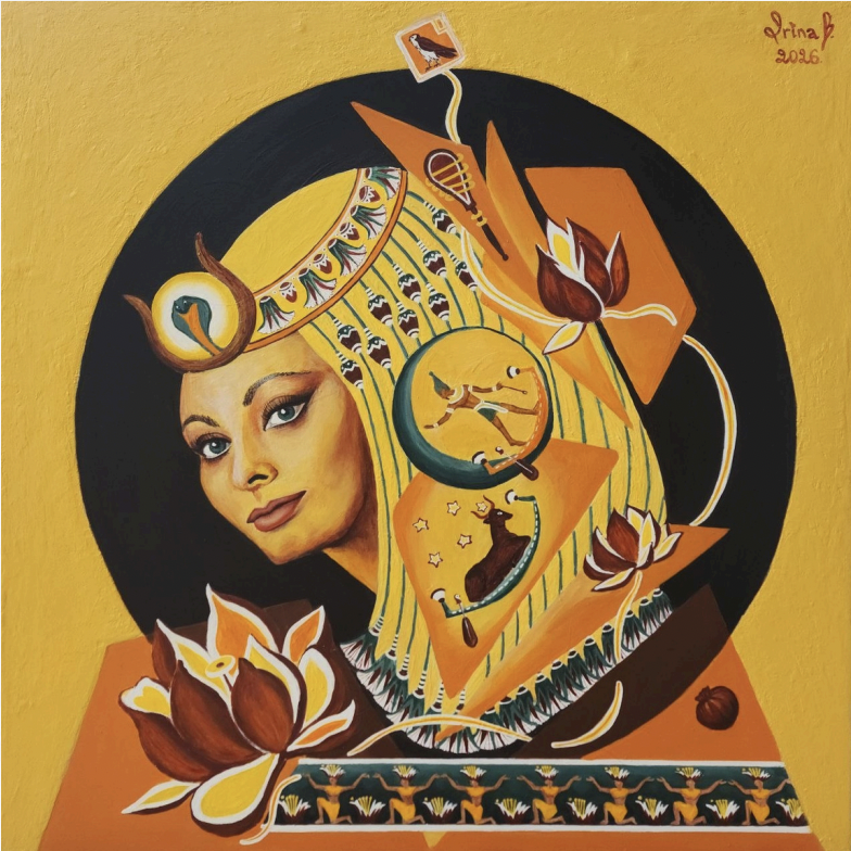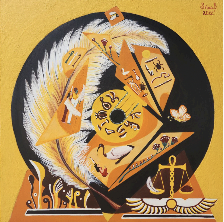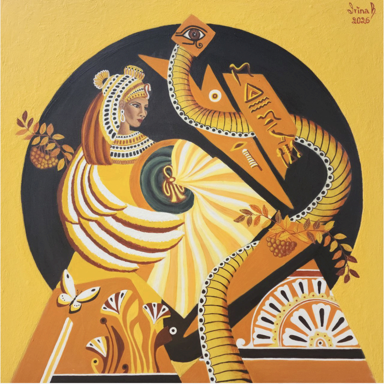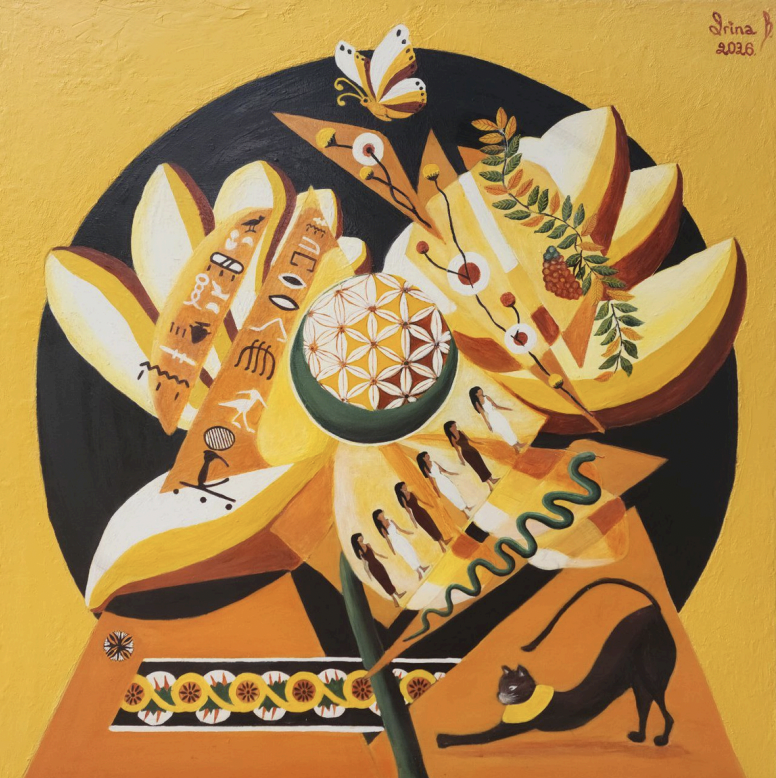 I work with acrylic painting as a medium that unites density with immediacy, brightness with multilayered depth. The material’s strength supports the search for an inner foundation; its chromatic intensity captures the force of experience; and its versatility allows me to work across cultural and temporal layers. The composition unfolds as a system of ornaments and symbols held together by a shared rhythm and atmospheric color. Archetypal images
