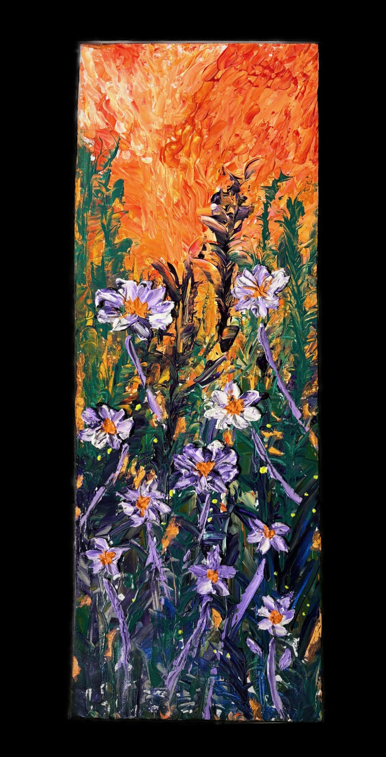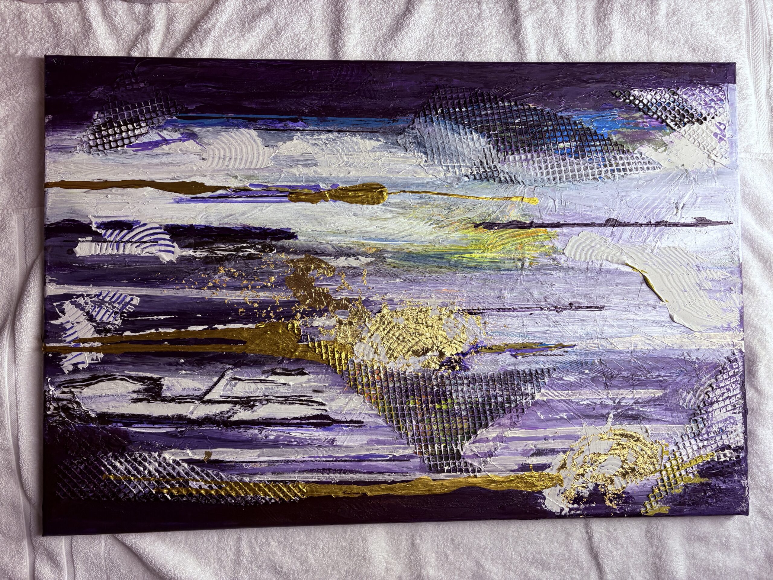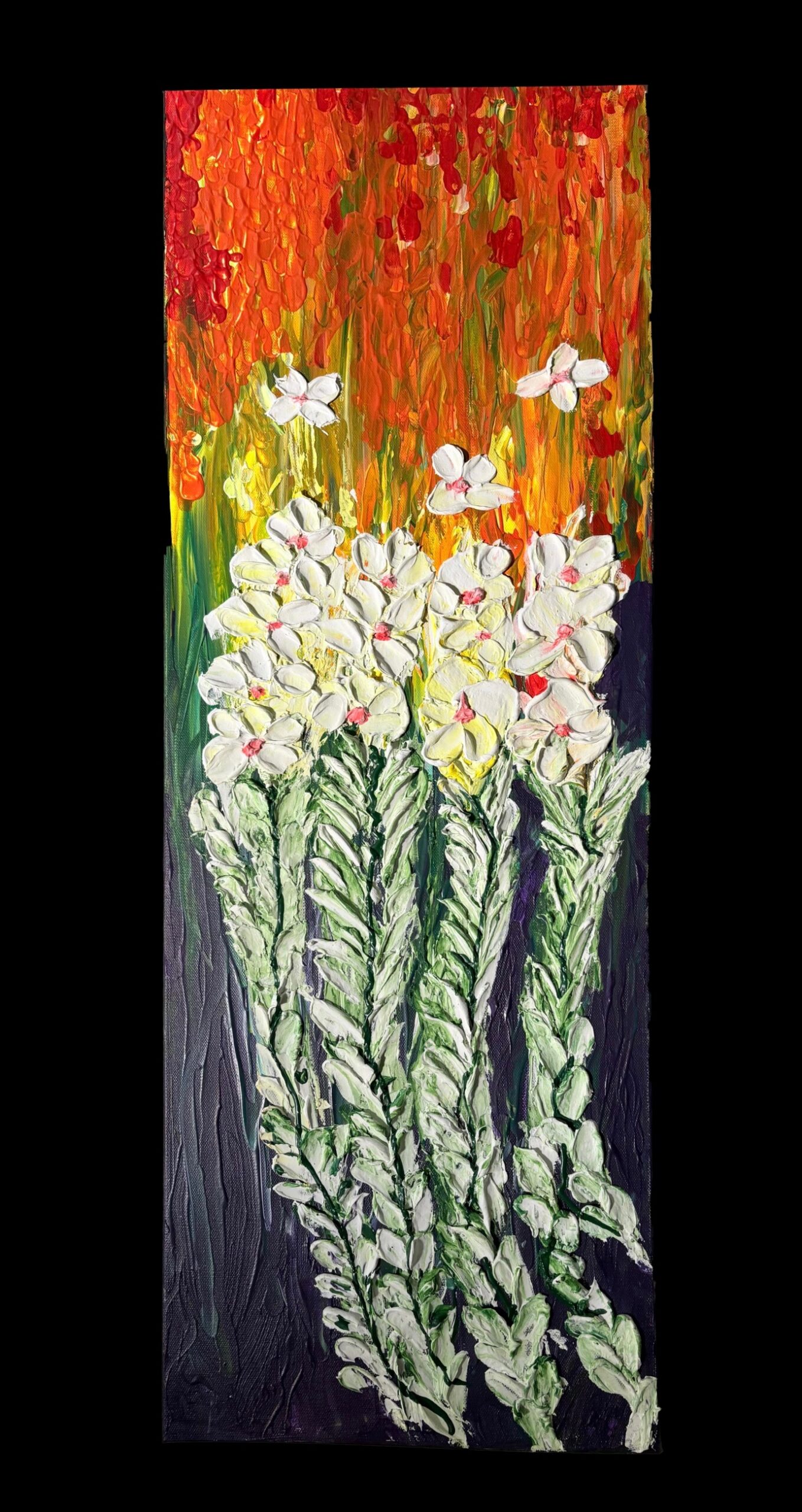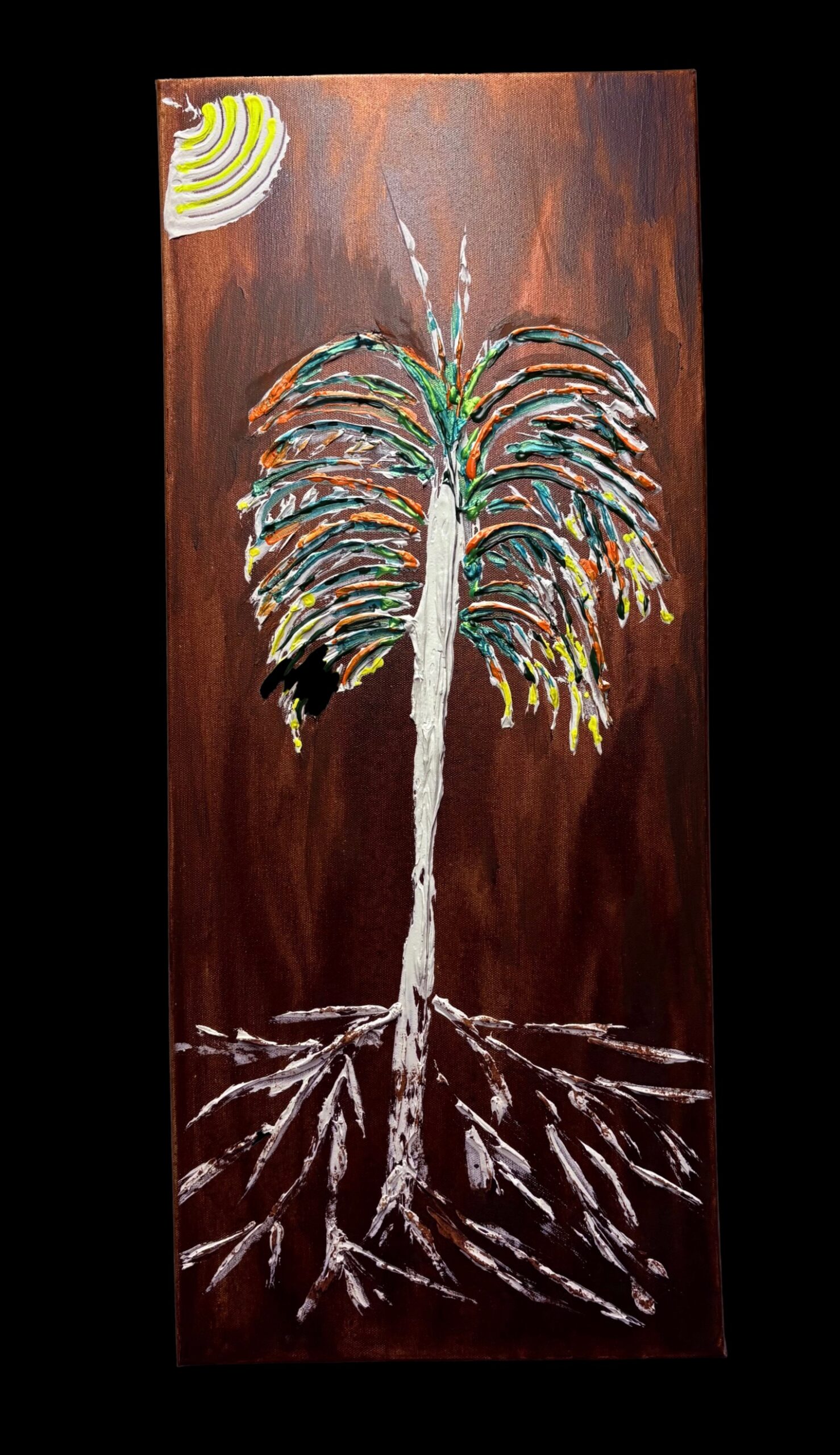 I am a self-taught painter I work primarily with acrylics and plaster on canvas, creating textured layers on surfaces that explore color movement and emotion. Through the years of experience with different mediums. I discovered my passion for building depth and energy through expressive brush work and materials. I continue to exert myself to master color combinations with every brush stroke making abstract art. Every single piece of art has different meaning to the eye of the beholder. I added a small sun or moon in the corners of all my work to signify its me 🙂
